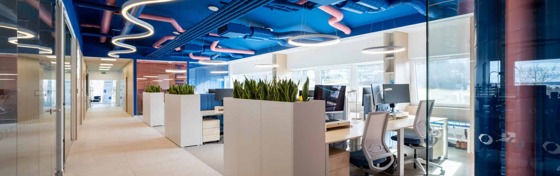 By merging interior architecture with our visual identity and technological expertise, the design naturally combines clean, modern lines with a transparent showcase of technology. Exposed wiring, HVAC systems, and fan coils are thoughtfully integrated as part of the architectural concept.